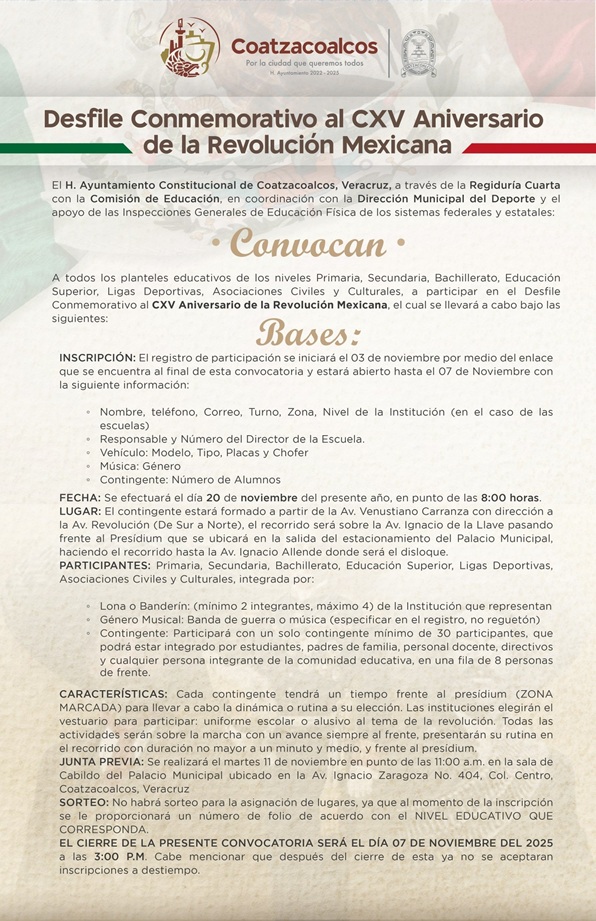 A todos los planteles educativos de los niveles Primaria, Secundaria, Bachillerato, Educación Superior, Ligas Deportivas, Asociaciones Civiles y Culturales, a participar en el Desfile Conmemorativo al CXV Aniversario de la Revolución Mexicana, el cual se llevará a cabo bajo las siguientes: