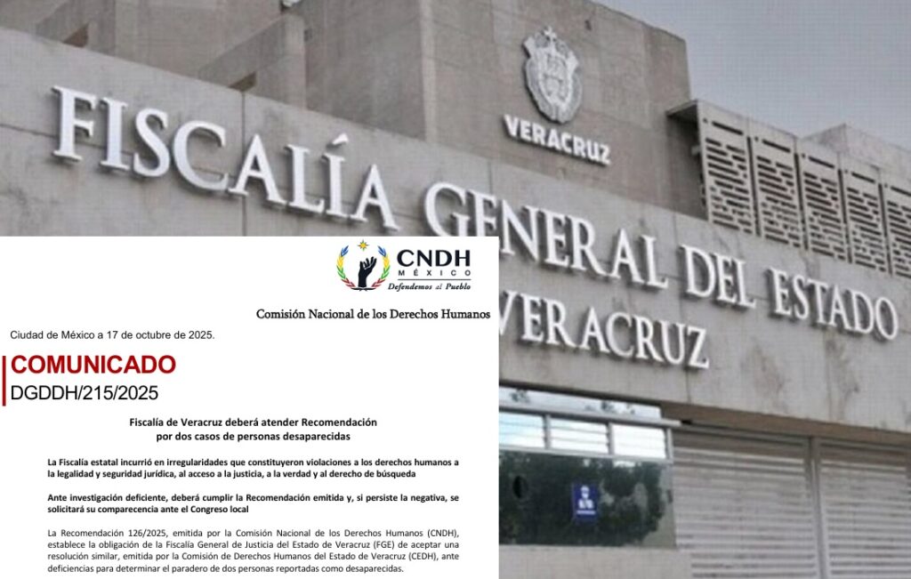 La Comisión Nacional de los Derechos Humanos, mediante el comunicado DGDDH/215/2025 dio a conocer que la Fiscalía General del Estado de Veracruz (FGE), nuevamente incurrió en irregularidades que constituyeron violaciones a los derechos humanos a la legalidad y seguridad jurídica, al acceso a la justicia, a la verdad y al derecho de búsqueda