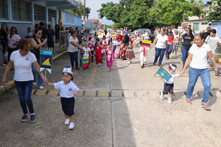 Durante el recorrido, los pequeños representaron a diversos países miembros de la ONU, luciendo trajes típicos, portando banderas y compartiendo con entusiasmo la riqueza cultural de cada nación. Padres de familia y personal docente se dieron cita para acompañar y aplaudir a los niños, quienes se convirtieron en verdaderos embajadores de la paz y la diversidad.