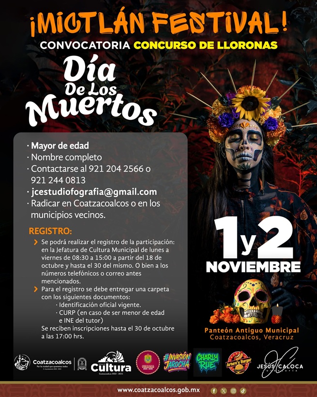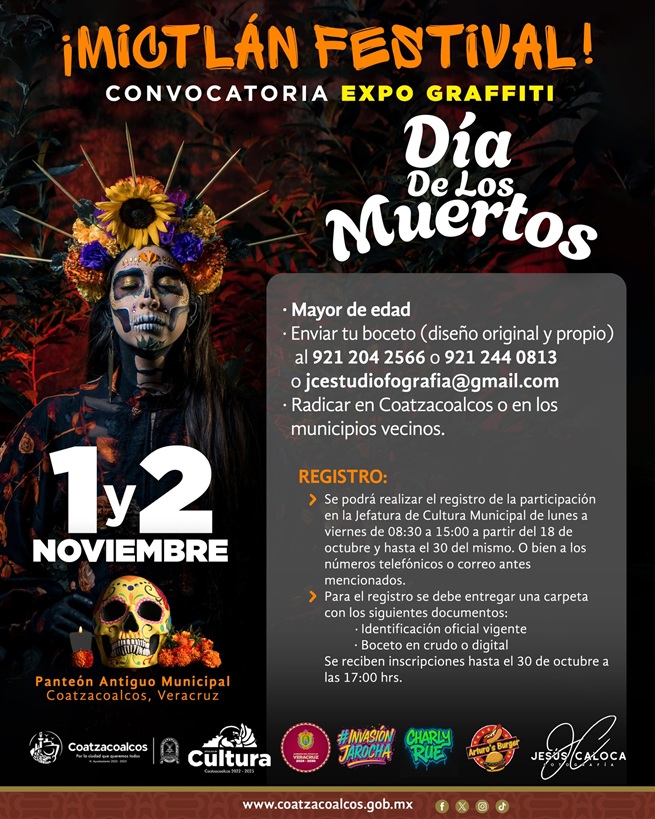 El Ayuntamiento de Coatzacoalcos, que preside Amado Cruz Malpica; te invita a participar en “Mictlán Festival” en sus dos convocatorias: Concurso de Lloronas y Expo Graffiti.