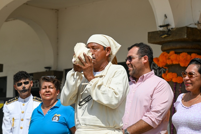 Para honrar la memoria de los fieles difuntos, el alcalde Dr. Jesús Fomperoza Torres acompañado de su esposa la Q.I. Melba López Gutiérrez, presidenta del DIF Tuxpan, colocaron la primera ofrenda al altar municipal instalado en la planta baja de presidencia, dentro de la celebración de Día de Muertos.