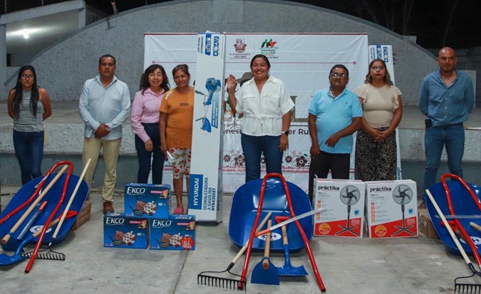 Durante su visita, inauguró la obra de construcción de guarniciones y banquetas de concreto hidráulico en la calle Lázaro Cárdenas, además de entregar equipos de trabajo de campo y artículos para el hogar, como parte de las acciones que se realizan en cada comunidad visitada.