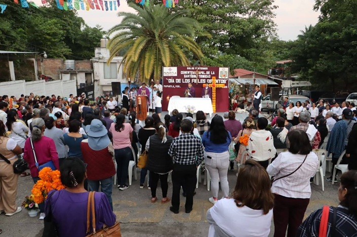 Dentro de las actividades de Ninín 2025 se llevó a cabo la misa a los Fieles difuntos desde la explanada del panteón municipal de la Santísima Trinidad el cual oficio el sacerdote Miguel Navarro Espinoza, en donde cientos de feligreses acudieron con fe y tradición.