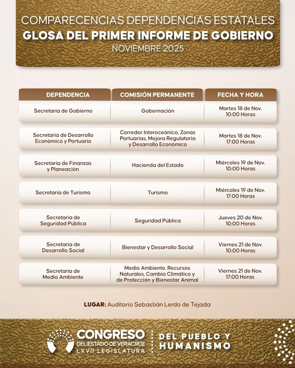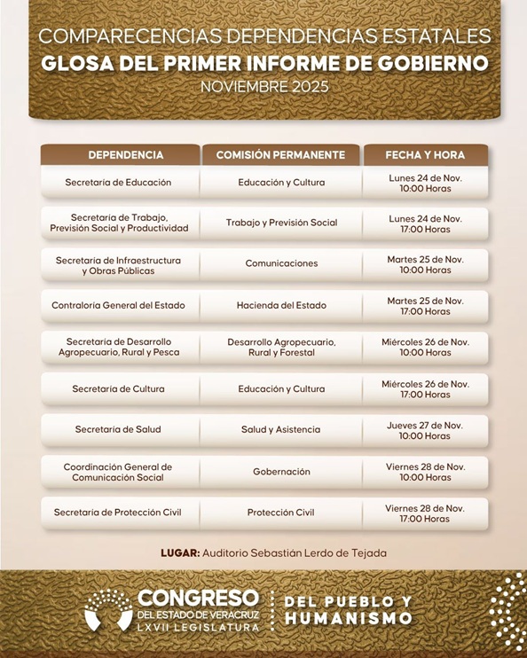 El miércoles 26, la Secretaría de Desarrollo Agropecuario, Rural  y Pesca (Sedarpa) se presentará a las 10:00 horas ante la Comisión Permanente de Desarrollo Agropecuario, Rural y Forestal. Este mismo día, a las 17:00 horas, la Secretaría de Cultura (SECVER) hará los trabajos correspondientes ante la Comisión Permanente de Educación y Cultura.