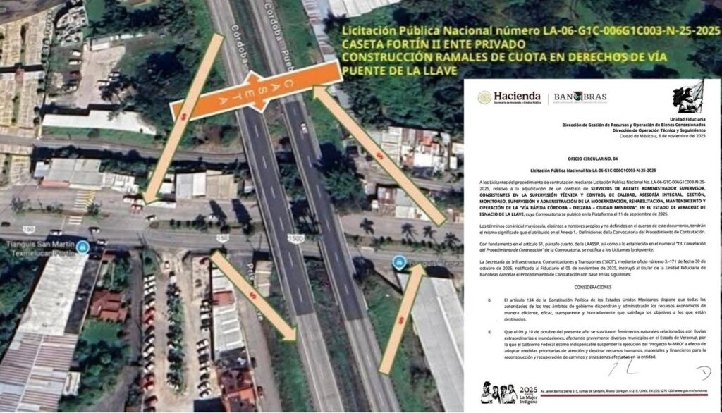 El proyecto, identificado como “Vía Rápida Córdoba–Orizaba–Ciudad Mendoza”, contemplaba la instalación de casetas en puntos como Vicente Guerrero y Fortín de las Flores. Aunque en semanas previas se habían realizado estudios técnicos de topografía y mecánica de suelos, la licitación pública nacional fue oficialmente cancelada, incluyendo la contratación del Agente Administrador Supervisor.