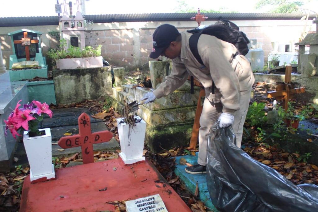 Los brigadistas realizaron tareas de recolección de objetos y recipientes, limpieza y deshierbe de áreas verdes y tumbas, relleno con arena húmeda en floreros y aplicación de larvicida en puntos estratégicos, garantizando espacios más limpios y seguros para las familias que, con motivo del Día de Muertos, visitaron a sus fieles difuntos.