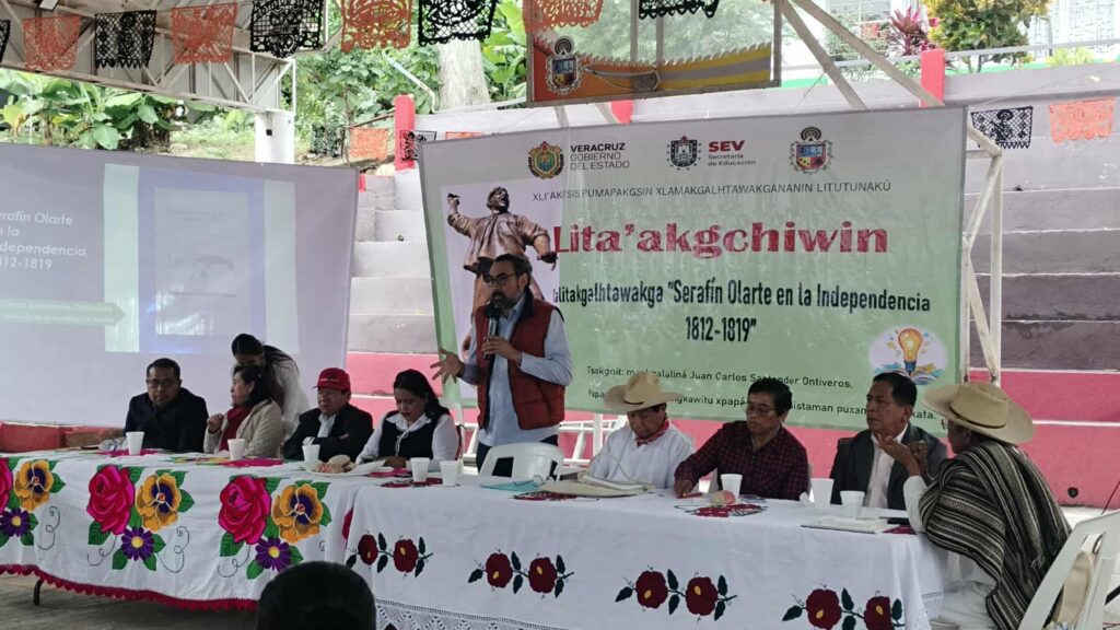 Al término de la presentación del libro se le dio un reconocimiento al Dr. Juan Carlos Santander Ontiveros por la presentación del libro “Serafín Olarte en la independencia 1812-1819, el cual fue dirigida a los maestros de educación indígena de la región Kalikilhtutunaku (Totonacapan).
