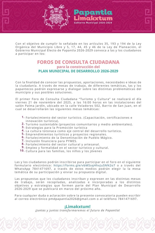 A este foro todos podrán sumarse a las mesas de trabajo, debido que “Cultura y turismo son temas fundamentales para nosotros es importante para seguir reactivando la economía, por eso se decidió que la invitación sea abierta para todos jóvenes, artistas, escritores, danzantes, Consejo de Voladores, proveedores de servicios turísticos, hoteleros restauranteros a todos para que juntas y juntos (Limakxtum) construyamos este plan municipal 2026- 2029, ¡Juntas y Juntos transformaremos el futuro de Papantla! finalizo.
