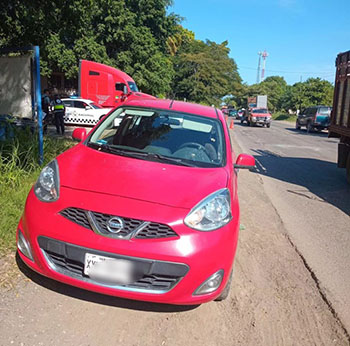 Momentos de pánico vivió una familia que se trasladaba a bordo de su vehículo Nissan March, cuando un tráiler lo siento en la parte posterior, frente a una báscula de la localidad de María de la Torre.
