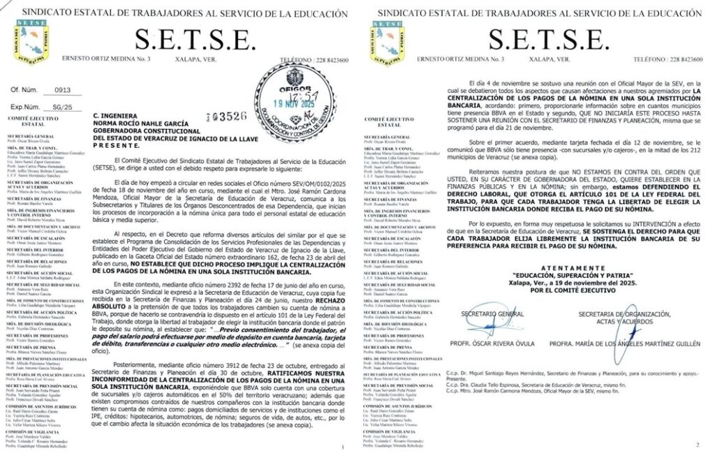 En un oficio número 0913 fechado el 19 de noviembre del año en curso y dirigido a la titular del Ejecutivo estatal, la organización sindical que encabeza Óscar Rivera Ovula, destaca la preocupación generada entre los agremiados por una circular oficial circulada el pasado 18 de noviembre de este año, que, según el magisterio, podrían implicar la centralización del pago salarial en un solo banco.