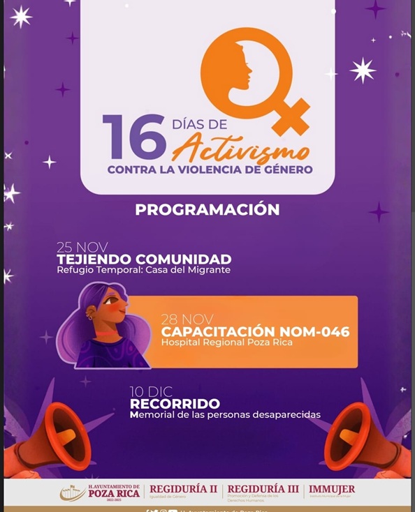 El Ayuntamiento de Poza Rica, a través del Instituto Municipal de las Mujeres (IMM), dio a conocer el calendario de actividades que se realizará del 25 de noviembre al 10 de diciembre como parte de la Jornada 25-N y los 16 Días de Activismo contra la Violencia de Género, con acciones enfocadas en atención, capacitación y sensibilización a distintos sectores de la población.