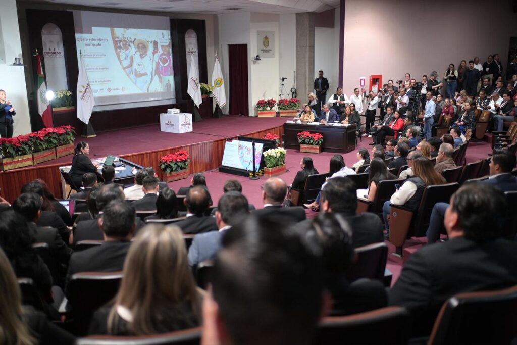 A las 10:06 horas, en el auditorio Sebastián Lerdo de Tejada del Palacio Legislativo, inició la exposición de la funcionaria acerca del trabajo y los logros de la presente administración para garantizar una gestión educativa con legalidad, transparencia y sentido social en 25 mil 339 escuelas para dos millones 33 mil 76 estudiantes con 136 mil 911 docentes en el estado.