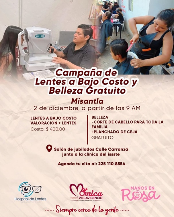 Con el objetivo de acercar servicios de salud visual y apoyo comunitario a las familias misantecas, este 2 de diciembre se llevará a cabo una campaña de lentes a bajo costo y servicios de belleza gratuitos, a partir de las 9:00 de la mañana, en el salón de jubilados ubicado en la calle Carranza, junto a la clínica del ISSSTE.