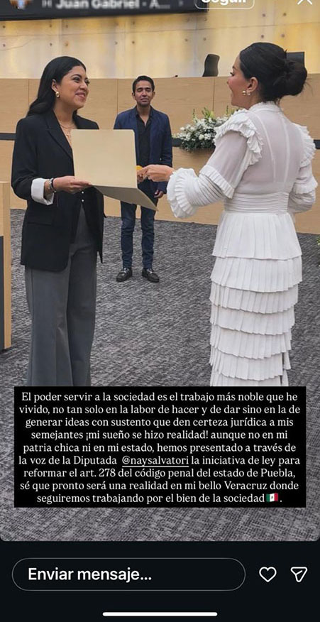 “El poder servir a la sociedad es el trabajo más noble que he vivido, no tan solo en la labor de hacer y de dar, sino en la de generar ideas con sustento que den certeza jurídica a mis semejantes. ¡Mi sueño se hizo realidad! Aunque aún no en mi patria chica ni en mi estado, la hemos presentado, a través de la voz de la Diputada de Puebla”, finalizó.