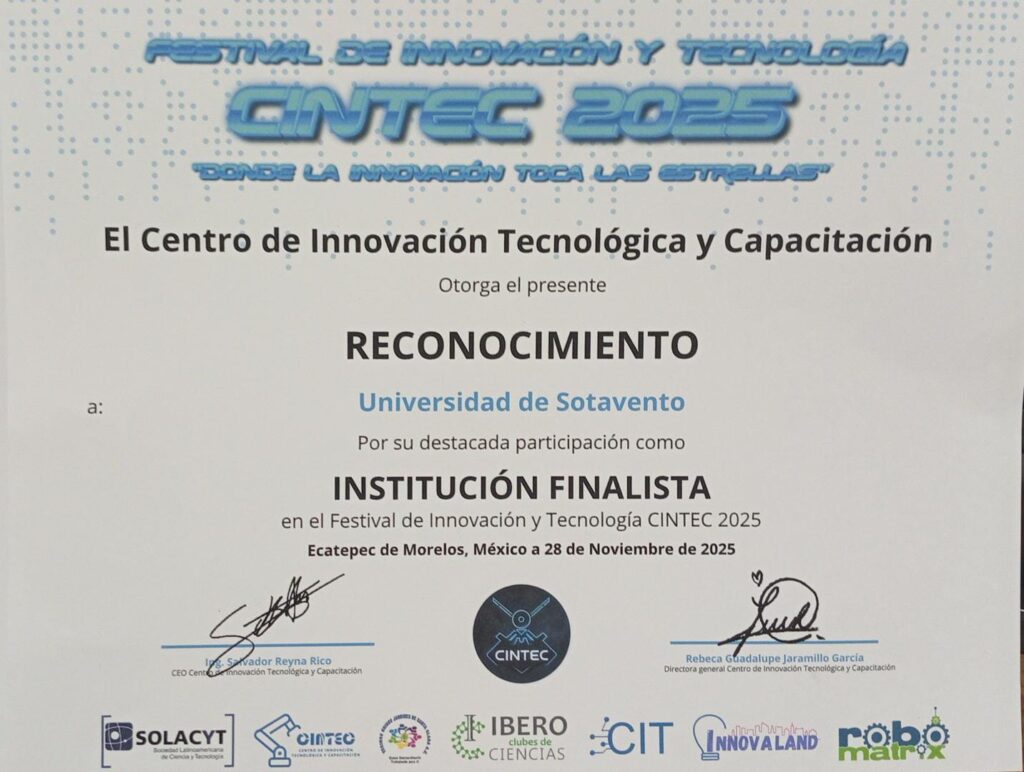 La Universidad de Sotavento fue distinguida además como Institución Finalista por su participación en esta edición del festival. CINTEC es organizado por el Centro de Innovación Tecnológica y Capacitación, en coordinación con SOLACYT, y reúne proyectos estudiantiles de ciencia, tecnología y multimedia de todo el país.