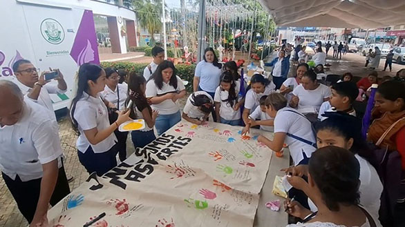Estudiantes de Tlapacoyan, Misantla y Martínez de la Torre se sumaron a la caminata y, posteriormente, dejaron su huella —literal y simbólicamente— en el mural diseñado para esta ocasión. También participaron maestros y autoridades municipales, entre ellas la regidora segunda, Carol Conde; la regidora tercera, Cristina Victoriano; el regidor quinto, José Reza; y el regidor cuarto, Andrés Rivera.