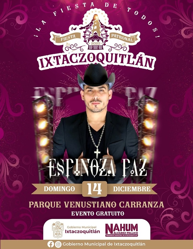 Espinoza Paz, uno de los máximos exponentes de la música regional, llega a Ixtaczoquitlán con éxitos que han marcado su trayectoria como «El próximo viernes», «Lo intentamos», «Un hombre normal» y «Para no perderte», temas que consolidaron su popularidad tanto en México como en el extranjero.