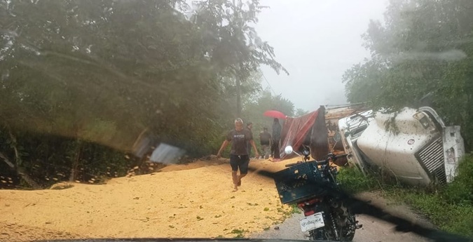 Varias toneladas de maíz quedaron esparcidas sobre la cinta asfáltica, luego de que un tráiler terminara volcado sobre la carretera Vega de la Torre – Misantla.