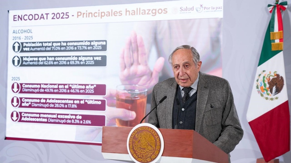 La Encuesta Nacional de Consumo de Drogas, Alcohol y Tabaco (Encodat) también reveló una baja en el consumo de alcohol en el último año a nivel nacional; no obstante en el reporte histórico va en aumento, al pasar de 71 a 73.7 por ciento. El funcionario destacó la disminución en el consumo de adolescentes (de 28% a 17.8%) y la reducción del consumo mensual excesivo en este grupo (de 8.3% a 2.6%).