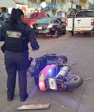 El accidente ocurrió a las 18:00 horas, en el crucero de Vicente Guerrero y general Ignacio Zaragoza, por dónde circulaba un automóvil Nissan con número económico 230 y con placa de circulación A-260- XGE del estado, unidad del transporte público que circulaba sobre la avenida y al pasar por dicho crucero una motonetas se le estrelló en el costado izquierdo de la parte frontal.