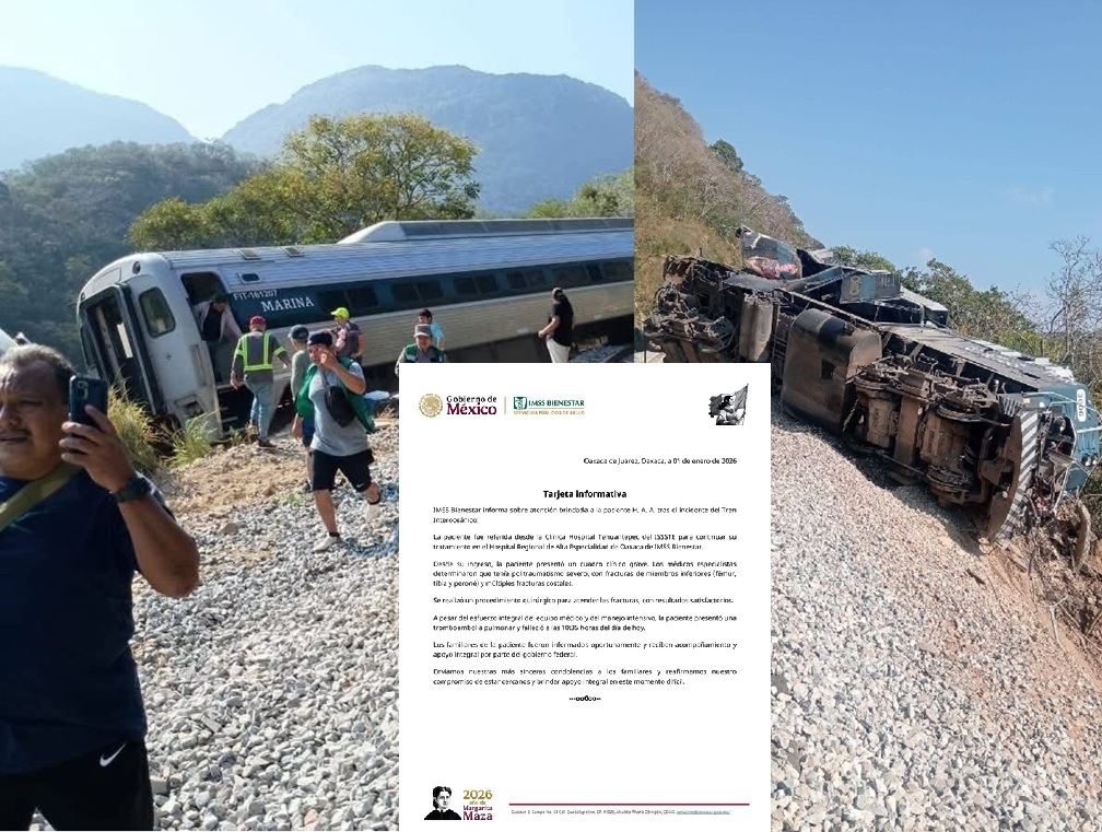 La señora Hilda A, de 73 años y quien fue una de las personas lesionadas en el accidente del Tren Interoceánico del pasado fin de semana, falleció este jueves a las 10:35 horas, informó el sistema IMSS Bienestar. En tanto, la Secretaría de Gobernación, por medio de la Comisión Ejecutiva de Atención a Víctimas (CEAV), lamentó el fallecimiento.