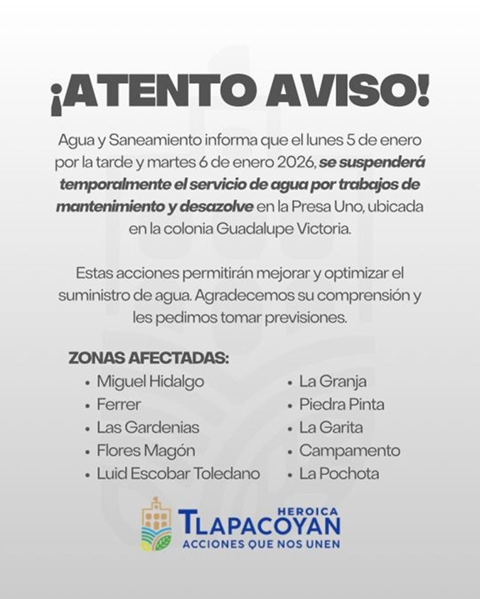 El área de Agua y Saneamiento del H. Ayuntamiento de Tlapacoyan informa a la ciudadanía que, debido a trabajos de mantenimiento y desazolve en la Presa Uno, ubicada en la colonia Guadalupe Victoria, se realizará una suspensión temporal del servicio de agua potable.
