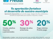 El Gobierno de Cosoleacaque, que preside Cirilo Vásquez Parissi; dio a conocer los descuentos especiales para el pago del predial 2026. Víctor Fuentes Fermín Cosoleacaque El Gobierno de