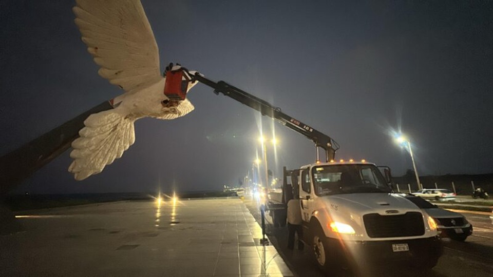 Como acción preventiva para evitar riesgos a la población ante el ingreso del Frente Frío Número 27, personal de Obras Públicas del Gobierno de Coatzacoalcos colocó un recubrimiento a la Paloma del Espíritu Santo, emblemática escultura ubicada en el malecón costero de la ciudad.