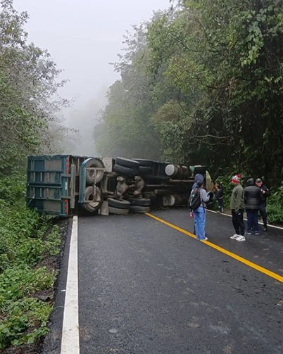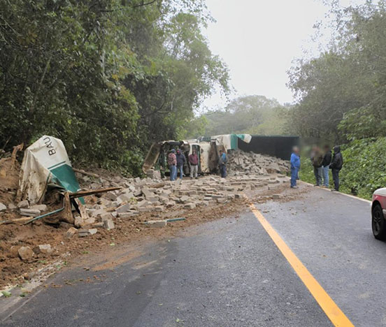 La volcadura de un camión cargado de varias toneladas de block provocó el cierre parcial de la carretera federal Tlapacoyan – Atzalan.