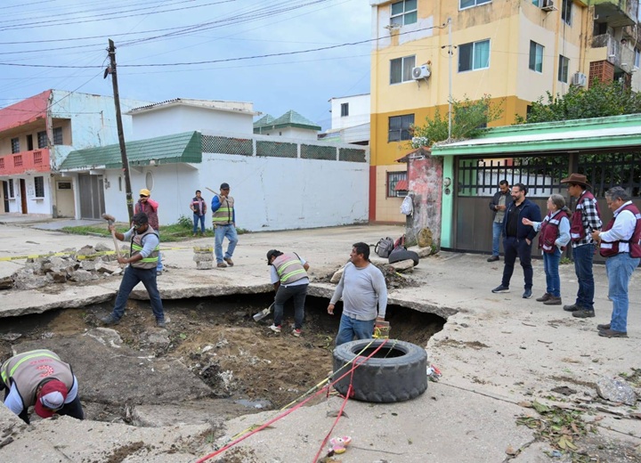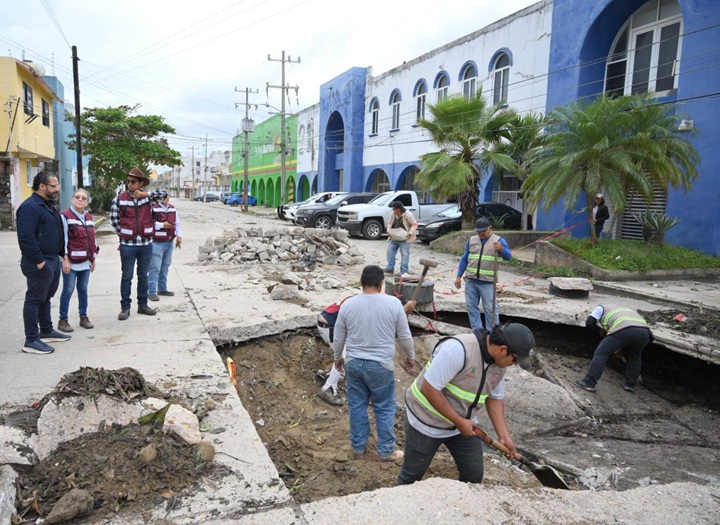 Como parte de estas acciones, Rosaldo García recorrió tres puntos estratégicos de la colonia Playa Sol, donde personal de la Dirección de Obras Públicas realiza labores de rehabilitación de drenajes sanitarios que provocaron severos socavones, beneficiando a cientos de familias y a miles de automovilistas que transitan por la zona.