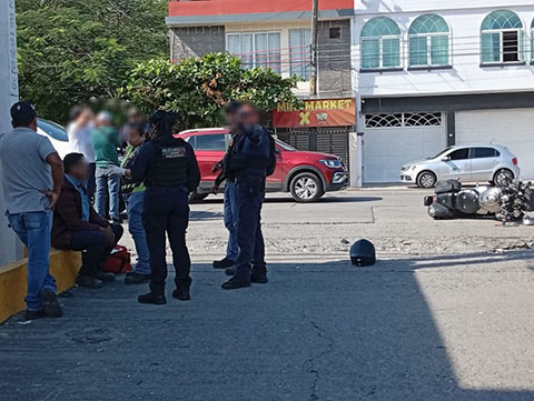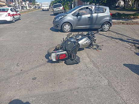La motocicleta con placas de circulación X9XE3 resultó con daños en la parte frontal, unidad que quedó tirada sobre el pavimento y el casco de su conductor registró daños materiales.