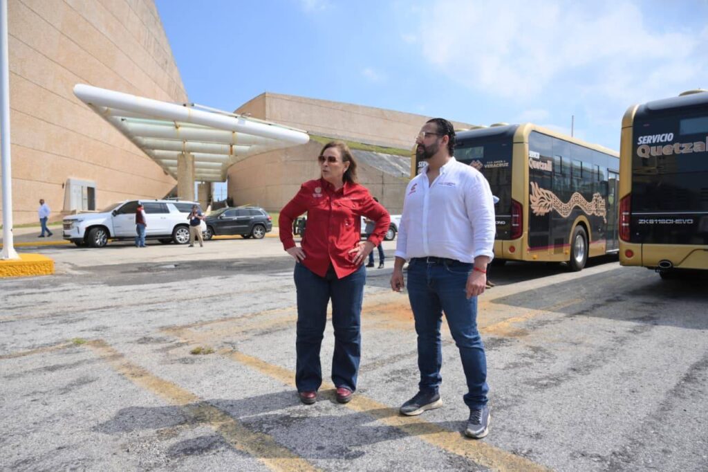 El punto central del recorrido tuvo lugar en el estacionamiento del Centro de Convenciones, donde la gobernadora y el alcalde supervisaron las 64 nuevas unidades de autobuses híbridos Quetzalli. Estas unidades, que ya se encuentran físicamente en la ciudad, representan el pilar de la modernización del transporte público en la región.