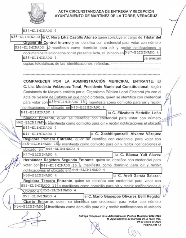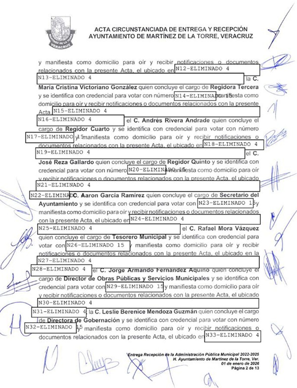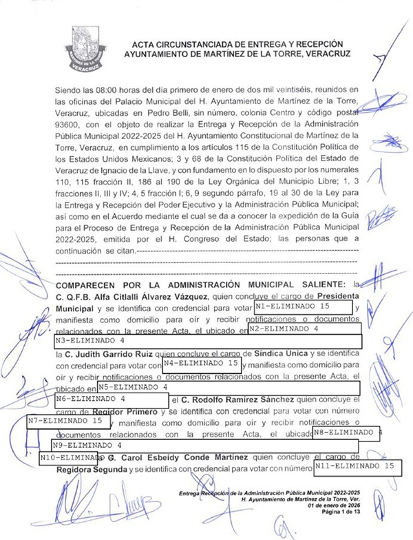 En cumplimiento con lo establecido en el artículo 25 de la Ley para la Entrega y Recepción del Poder Ejecutivo y la Administración Pública Municipal, el H. Ayuntamiento de Martínez de la Torre informa que se encuentra disponible para consulta pública el Acta Circunstanciada de la Entrega y Recepción del periodo 2022–2025.