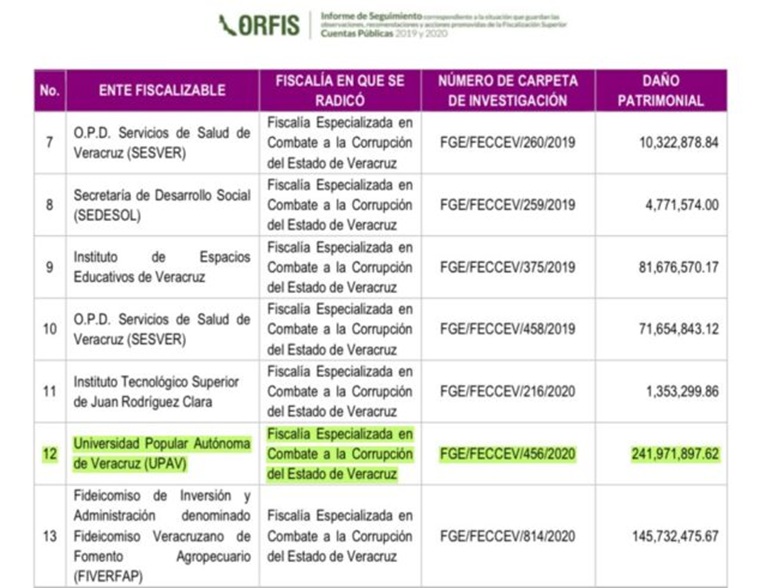 El 05 de septiembre de 2022, el Órgano de Fiscalización Superior del Estado de Veracruz (ORFIS), en el Oficio OFS/AG_ST/18492/09/2022 informó al Congreso del Estado de Veracruz que derivado de la Fiscalización Superior de las Cuentas Públicas 2019 y 2020, se interpuso una denuncia ante la Fiscalía General del Estado por un daño patrimonial en la Universidad Popular Autónoma de Veracruz (UPAV), por 241 millones 971 mil 897 pesos con 62 centavos.