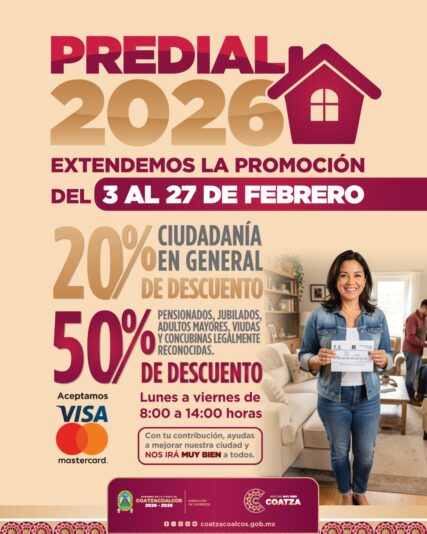 El Gobierno de Coatzacoalcos, que encabeza el alcalde Pedro Miguel Rosaldo García, informó que el plazo para obtener descuentos por pronto pago del impuesto predial se amplía durante febrero, con el objetivo de que la ciudadanía aproveche las facilidades para cumplir con esta contribución.