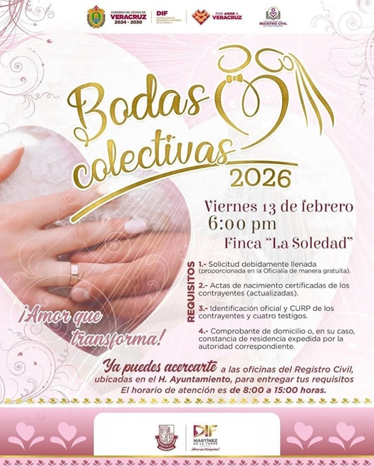 El H. Ayuntamiento de Martínez de la Torre, en coordinación con el Registro Civil y el DIF Municipal convocan a las parejas que viven en unión libre a participar en el programa Bodas Colectivas 2026, una acción que busca fortalecer la unión familiar y brindar certeza jurídica.