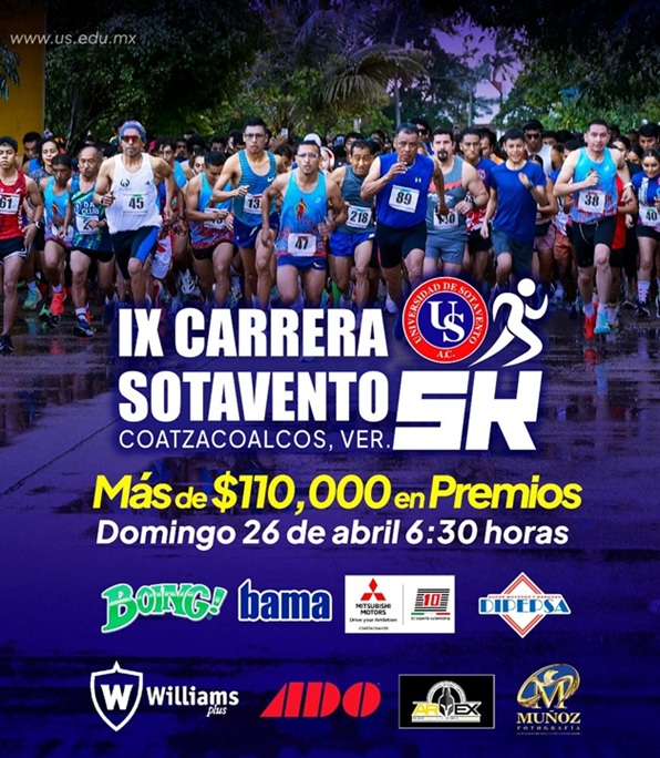 La Universidad De Sotavento (US) en coordinación con el Honorable Ayuntamiento De Coatzacoalcos, Veracruz y la Dirección Municipal del Deporte convocan a la IX Carrera Sotavento 2026, de 5 kilómetros, que se realizará el domingo 26 de abril a las 6:30 horas.