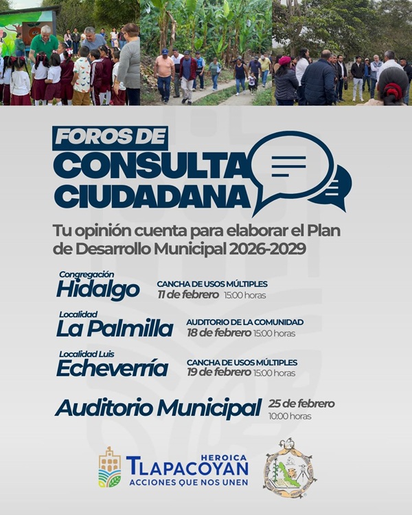 El Ayuntamiento de Tlapacoyan, que preside Miguel Ángel Cervantes, invita a la ciudadanía a participar en los Foros de Consulta Ciudadana, un ejercicio cuyo objetivo es recopilar las propuestas, necesidades y opiniones de la población para la elaboración del Plan de Desarrollo Municipal 2026–2029.