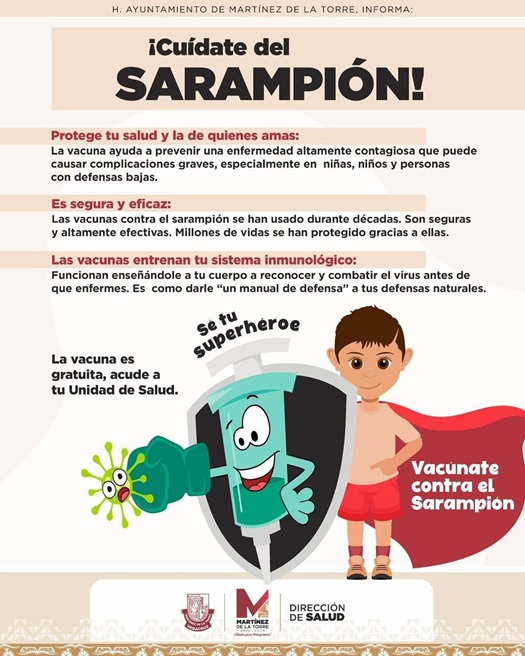 El H. Ayuntamiento de Martínez de la Torre, a través de la Dirección de Salud, exhorta a la población a vacunarse contra el sarampión, una enfermedad altamente contagiosa que puede ocasionar complicaciones graves, principalmente en niñas, niños y personas con defensas bajas, como parte de las acciones permanentes de prevención en materia de salud pública.