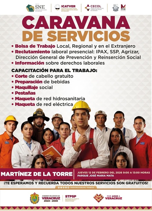El H. Ayuntamiento de Martínez de la Torre informa sobre la realización de la Caravana de Servicios para el Empleo, una jornada gratuita dirigida a la ciudadanía, que se llevará a cabo el jueves 12 de febrero, de 9:00 a 13:00 horas, en el Parque José María Mata, con el objetivo de fortalecer el acceso al empleo y al autoempleo en el municipio.