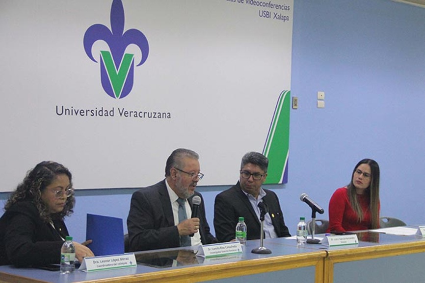 El conferencista estuvo acompañado por Luis Isauro García Hernández, director del Instituto de Investigaciones Cerebrales; de Donají Chi Castañeda y Leonor López Meraz, coordinadoras del posgrado y el coloquio, respectivamente.