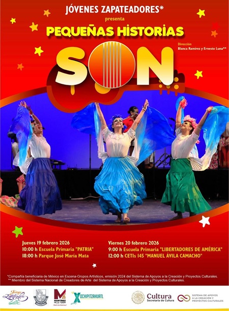 El próximo jueves 19 de febrero de 2026 se presentará en el municipio el espectáculo didáctico infantil “Pequeñas historias Son”, a cargo de la compañía Jóvenes Zapateadores (México en Escena), con funciones dirigidas a niñas, niños y público en general.