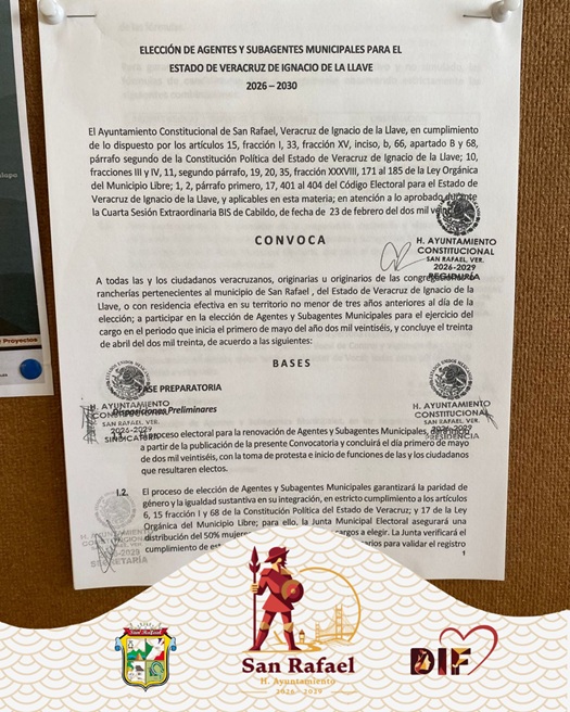 El H. Ayuntamiento de San Rafael, Veracruz, informa a la ciudadanía que este 25 de febrero, y en cumplimiento a lo establecido en el artículo 173 de la Ley Orgánica del Municipio Libre del Estado de Veracruz, se llevó a cabo la publicación de la convocatoria para la elección de Agentes y Subagentes Municipales, en tiempo y forma.