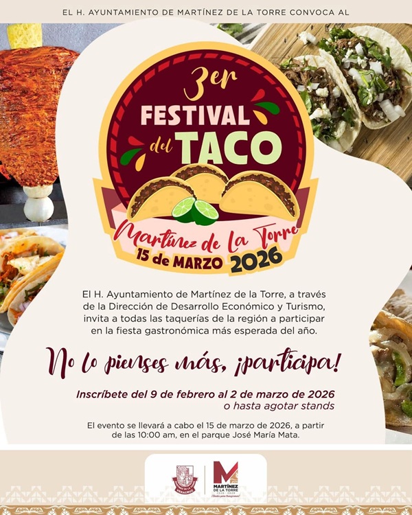 Con el objetivo de impulsar la gastronomía local y fortalecer la actividad económica y turística del municipio, se convoca a taqueros, parrilleros y maestros del trompo de la región a participar en el 3° Festival del Taco Martínez de la Torre 2026.
