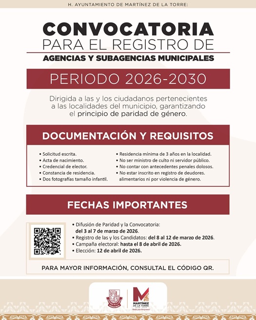 Se informa a la ciudadanía de las distintas localidades del municipio sobre la apertura de la Convocatoria para el registro de Agencias y Subagencias Municipales correspondiente al periodo 2026-2030, garantizando en todo momento el principio de paridad de género.