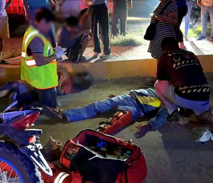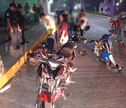 Por los aires salieron volando tripulantes de dos motocicletas, al chocar ambas en el crucero de la carretera que conduce al Diamante y carretera federal Libramiento.