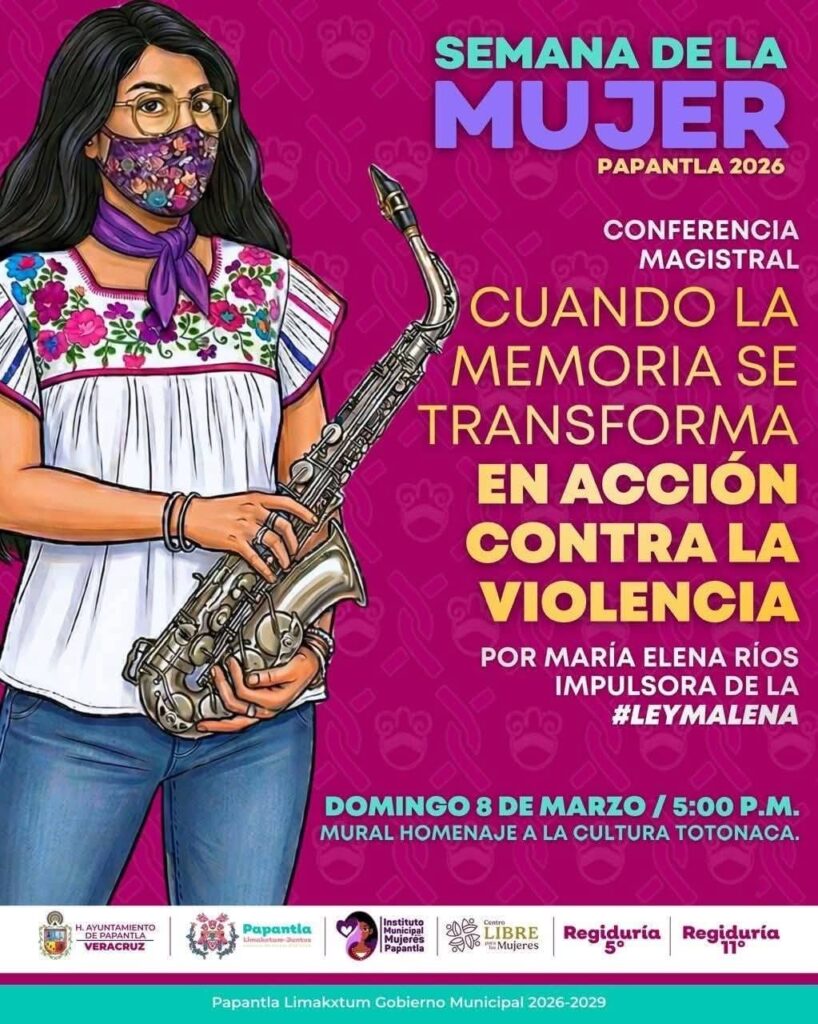 Como parte de las actividades de esta semana con motivo de la conmemoración del Día Internacional de la Mujer, el gobierno municipal que preside el alcalde Mtro. Gonzalo Flores Castellanos en coordinación con la regidora quinta Dra. Xochitl López Castillo y dirección del instituto de la mujer, invitan a la población papanteca  a recibir  a la activista nacional e impulsora de la #LeyMalena, Elena Rios Ortiz.