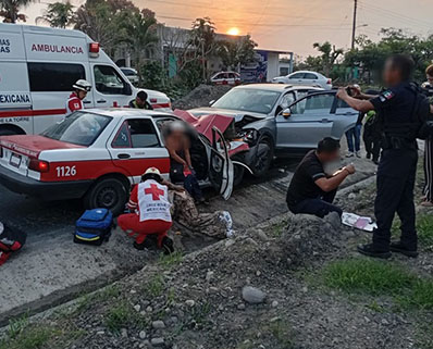 Siete personas resultaron lesionadas, tras de registrarse un fuerte impacto frontal, entre un automóvil Nissan Tsuru en su modalidad taxi y una camioneta particular.