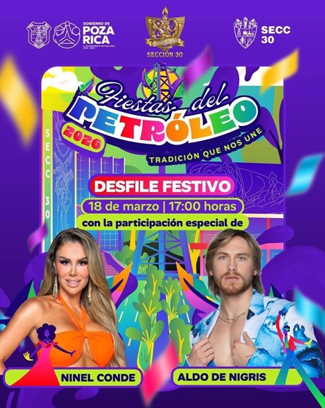 Este 18 de marzo a las 17:00 hrs, Gran Desfile Fiestas del Petróleo 2026 “Fiesta que nos une, con la participación de Ninel Conde y Aldo de Nigris.