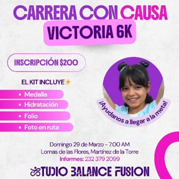Con el objetivo de apoyar una causa social, como es el problema de salud que enfrenta la pequeña victoria; se llevará a cabo una carrera con causa “Victoria 6K”, que se realizará el próximo domingo 29 de marzo.
